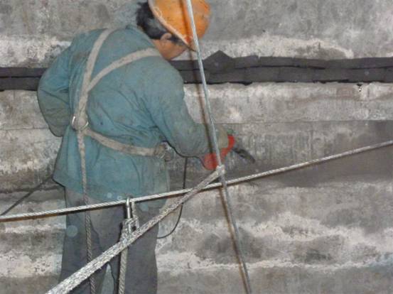 2007年10月26日三门峡华阳电厂 1#机组停产大修,2#机组保持运行发电,同时在2号机组安装了60m高的临时烟囱,在临时烟囱安装好进行烟气切换时,发现厚烟道闸门关闭不严,有30%的烟气仍从原烟囱排出。 主要原因是:临时烟囱设计高度不够,排气量达不到要求,引风机装的位置不正确,还有闸门时间较长关闭不严。 具体措施: 由于出现了上述情况,为抢工期,确保安全的前提下,我公司技术人员研究了当时的烟气流量和温度,综合当时的施工环境,做出了前所未有的方案,也可以说是脱硫防腐史上的 次,在煤炉正常运转情况下,在烟道上方35公分厚的砼结构上开4m长的槽,宽度30cm(因烟道的宽度为4m,高度为9m)然后用铁板和木板焊成4m×10m的闸门,并用脚手架做成骨架。然后用起重装置吊起插入烟道,做一个临时的烟道门。 烟道门作好后,工人带氧气瓶用砖和水泥砌一道防烟墙防止烟气进入。 但由于三门峡华阳电厂已运行十年,烟道中的耐火砖和珍珠岩板已和墙体有一定的间隙,还有少量的烟气进入烟道,特别是中午时间气压低时,工人难以承受,为了抢工期,抓质量,保安全,调整工作时间,避开不利时间,使业主认为不可能按期完工变为可能。 工程已于2007.12.2顺利完工,验收一次合格。烟囱防腐施工中,盐城华夏高空公司施工人员未发生一次违章,未发生一次大小事故,受到了华阳电厂和大唐监理公司的一致好评。